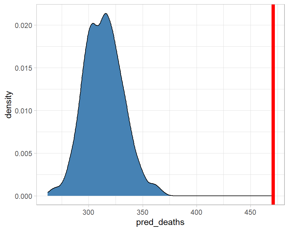 The model predicted about 320 deaths, with zero probability that there would be more than about 375, yet there were 471. The model fails quite dramatically for this category.