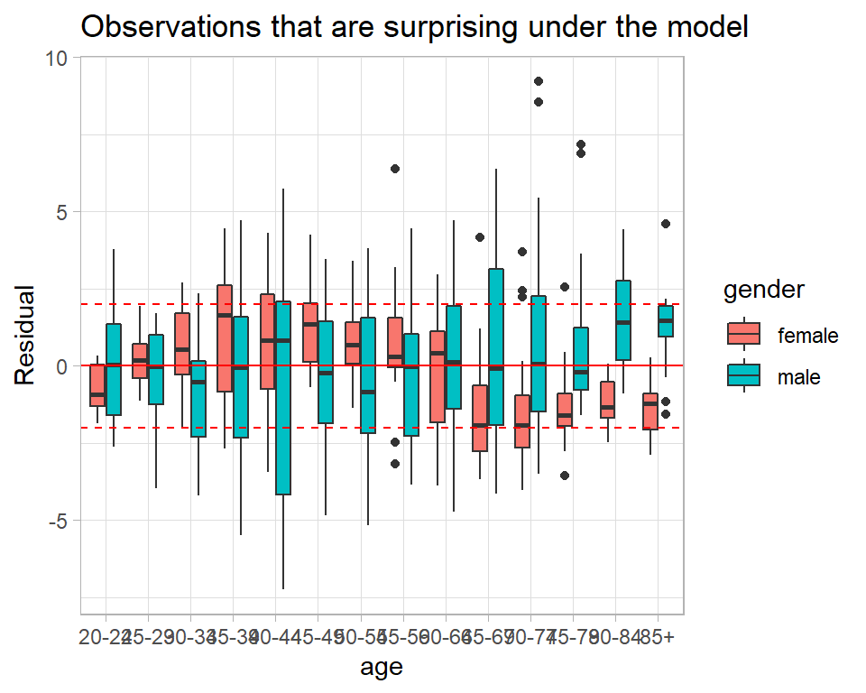 Here is a plot of the Bayesian residuals by age and gender. The individual points represent different years within the age-gender categories.