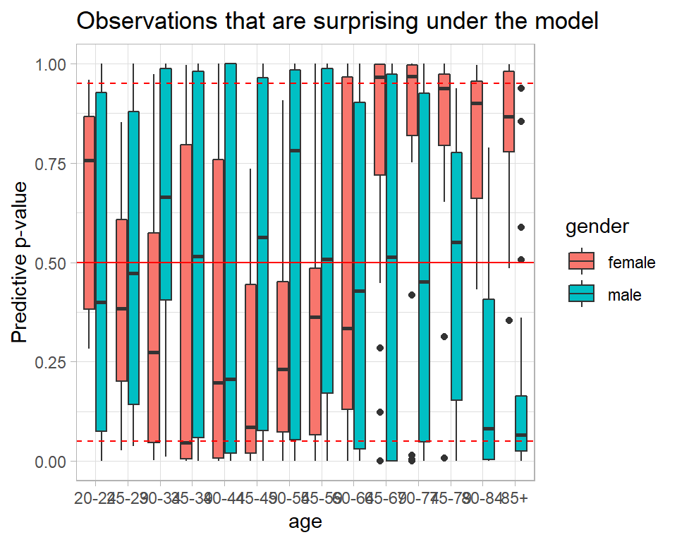In the older age groups the model often under predicts the data for men and over predicts the data for women. Perhaps, an age by gender interaction is needed.