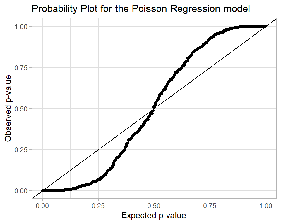 Were the model perfect, the p-values would follow a uniform (0,1) distribution. So we could make a probability plot