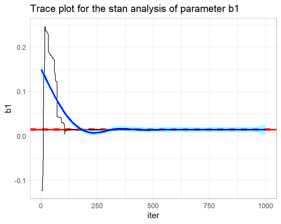 labs(title="Trace plot for the stan analysis of parameter b1")