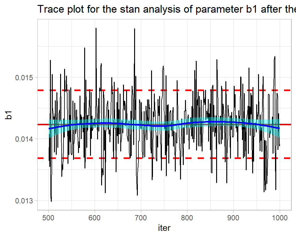 labs(title="Trace plot for the stan analysis of parameter b1 after the warmup")
