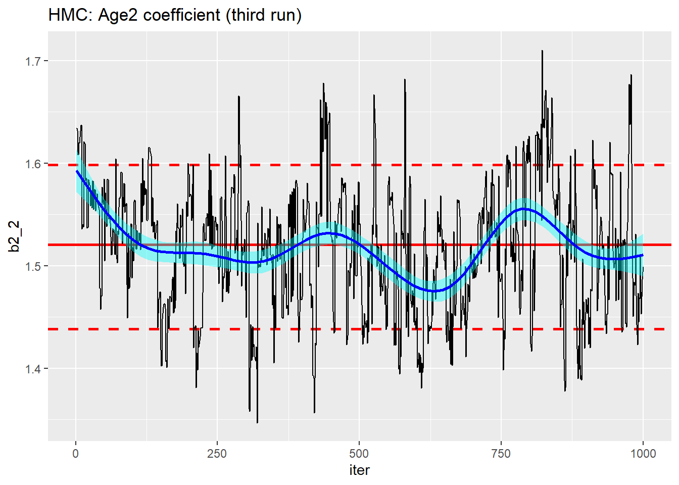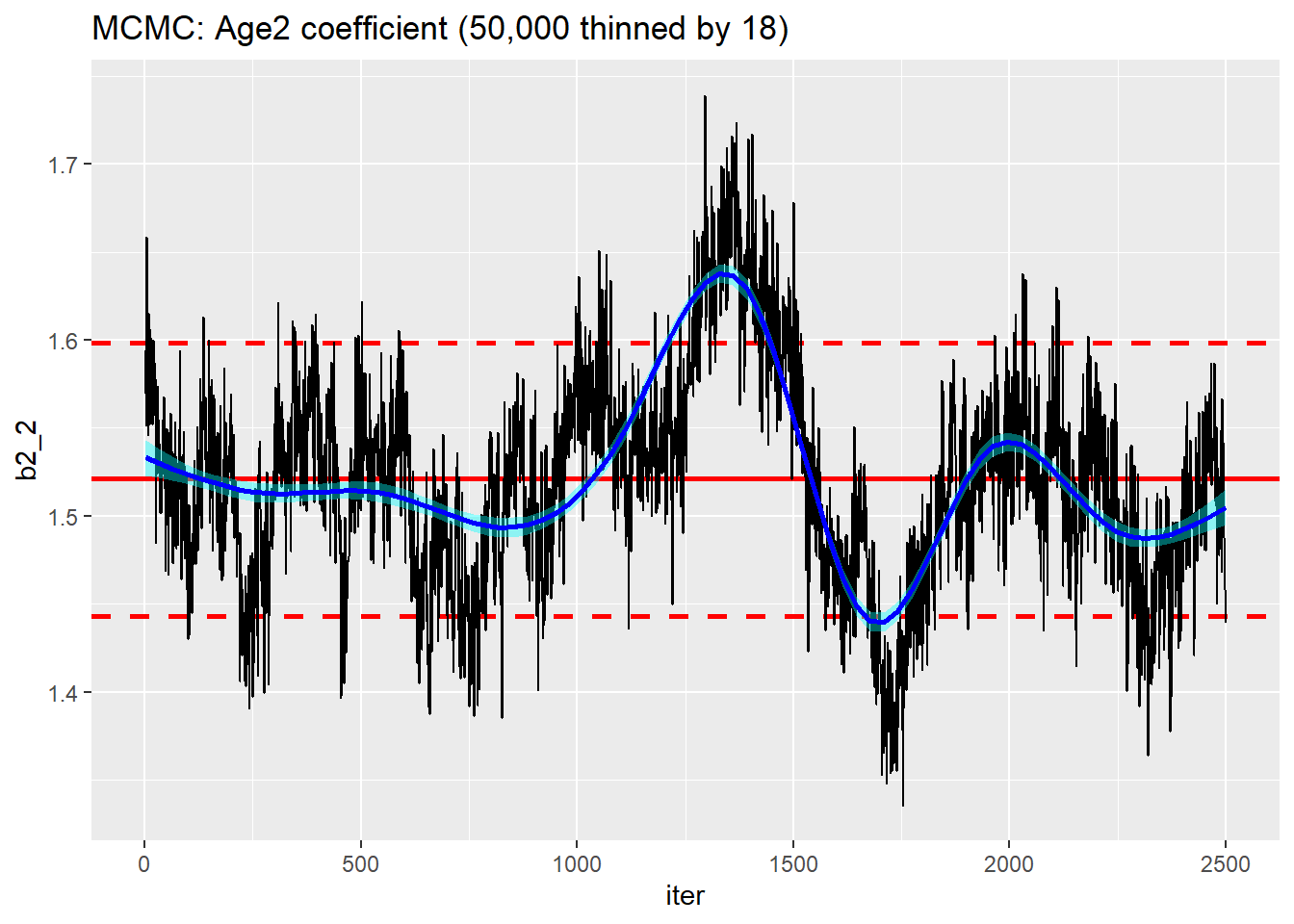 We seem to be close to convergence for b1, but how about the other parameters. Here is a trace plot of the second age term obtained from the third run of the algorithm.