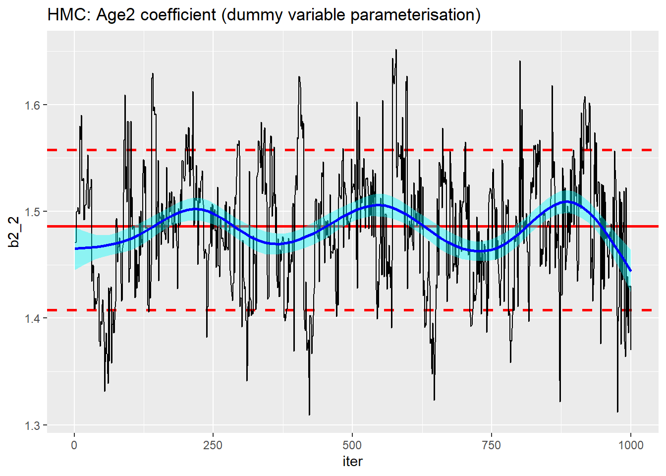 labs(title="HMC: Age2 coefficient (dummy variable parameterisation)")