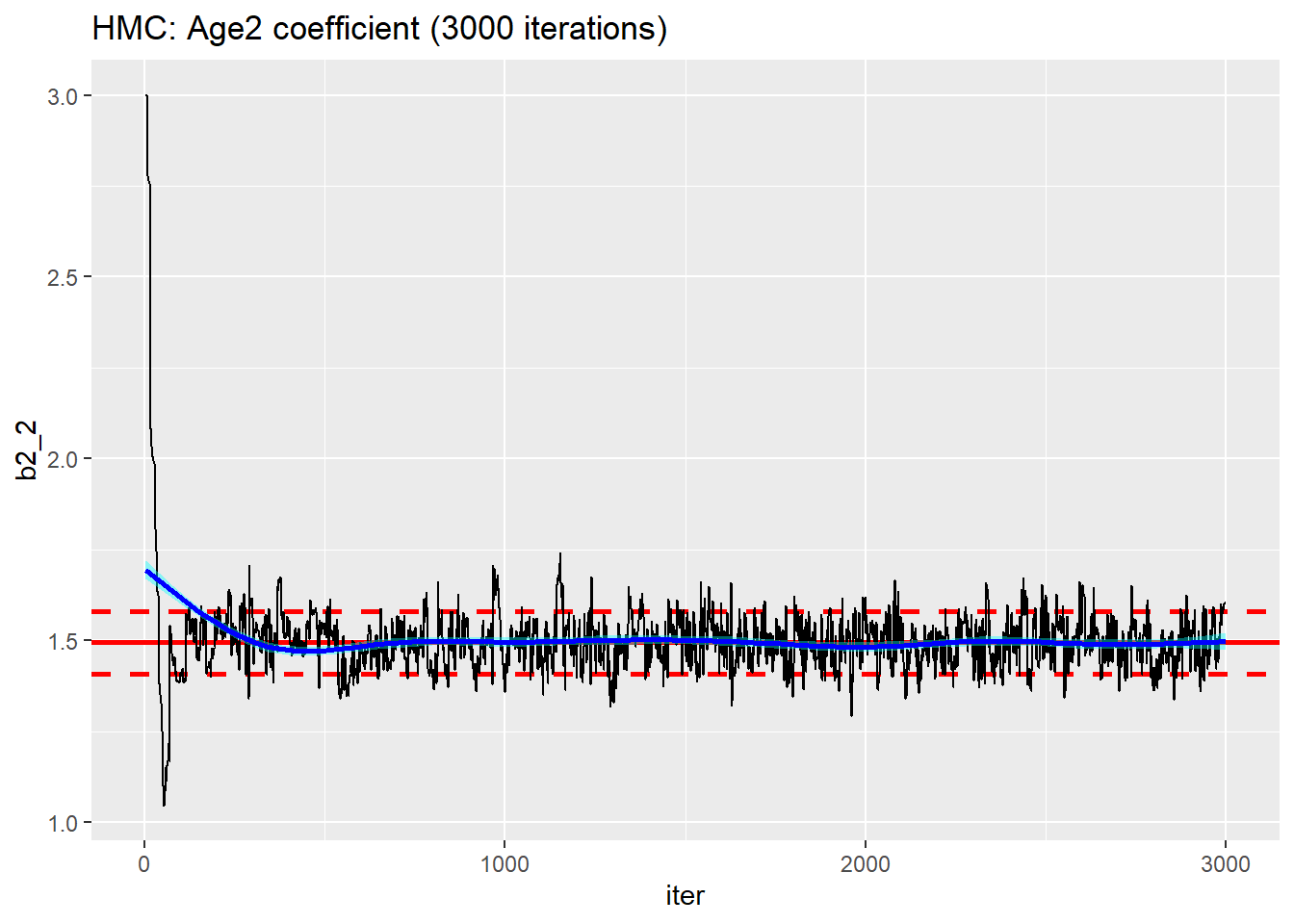 labs(title="HMC: Age2 coefficient (3000 iterations)")