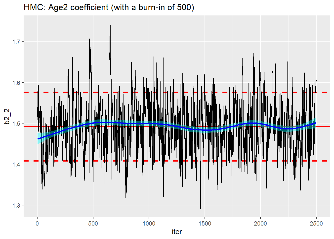 labs(title="HMC: Age2 coefficient (with a burn-in of 500)")