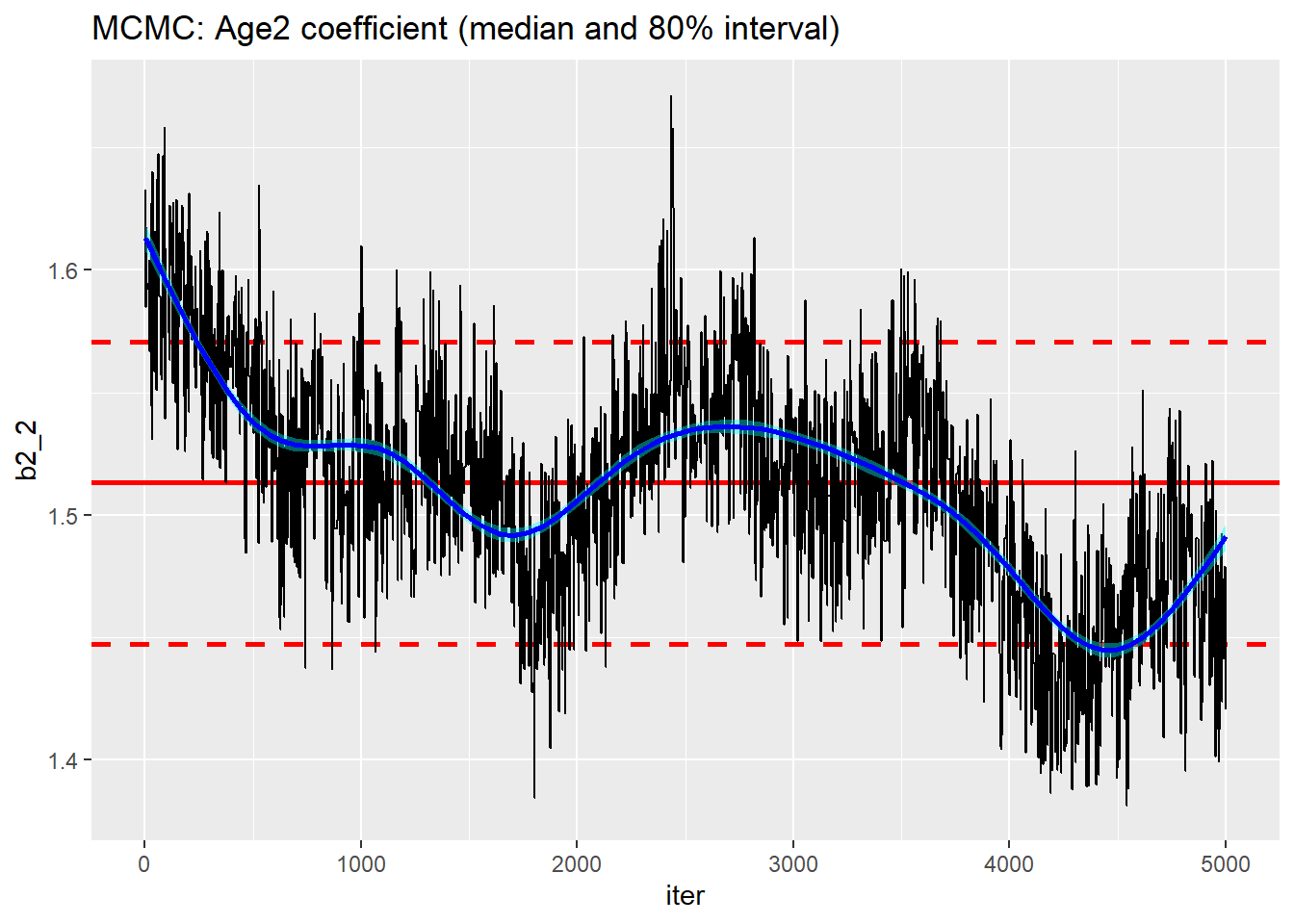 labs(title="MCMC: Age2 coefficient (median and 80% interval)")