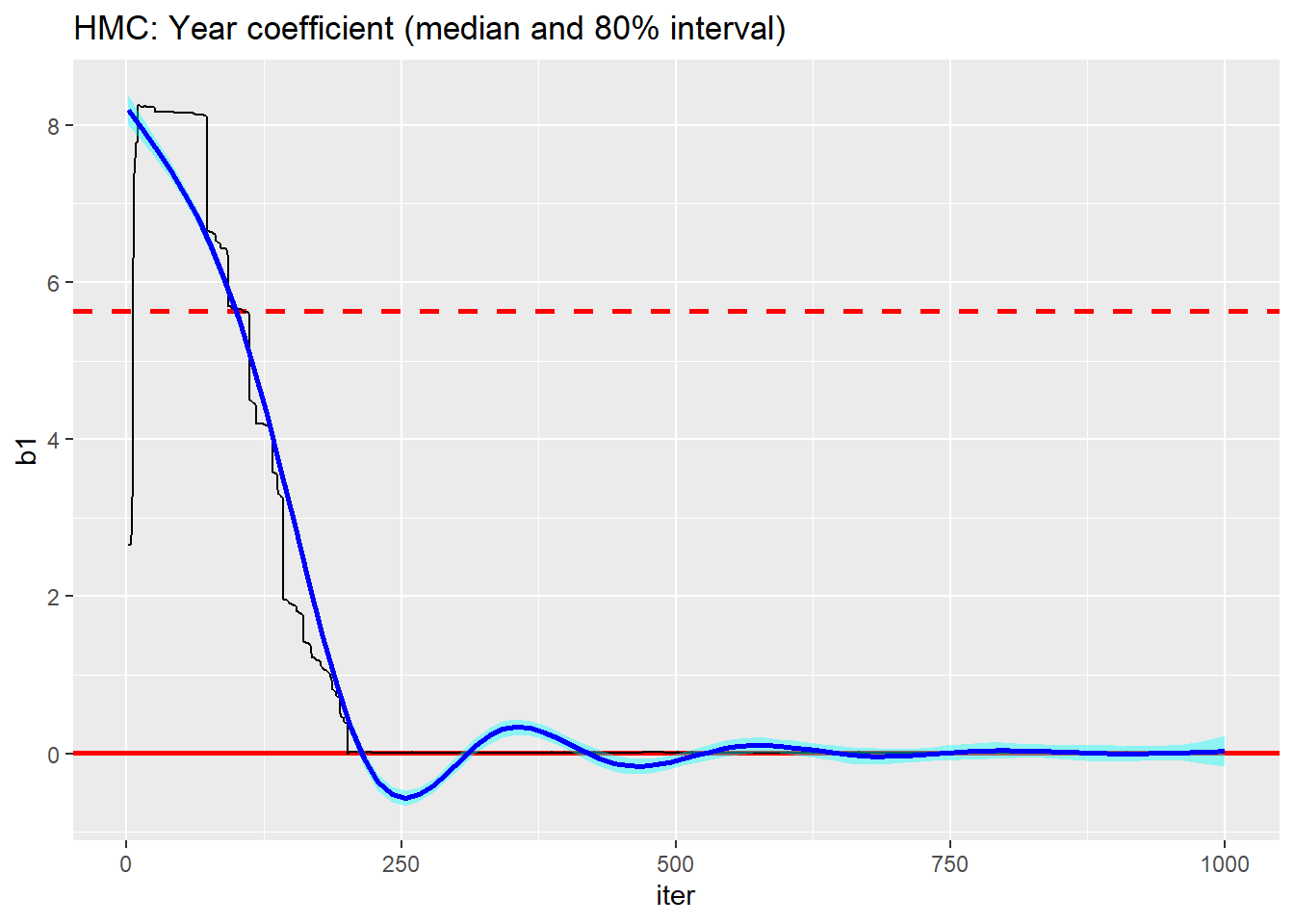 labs(title="HMC: Year coefficient (median and 80% interval)")