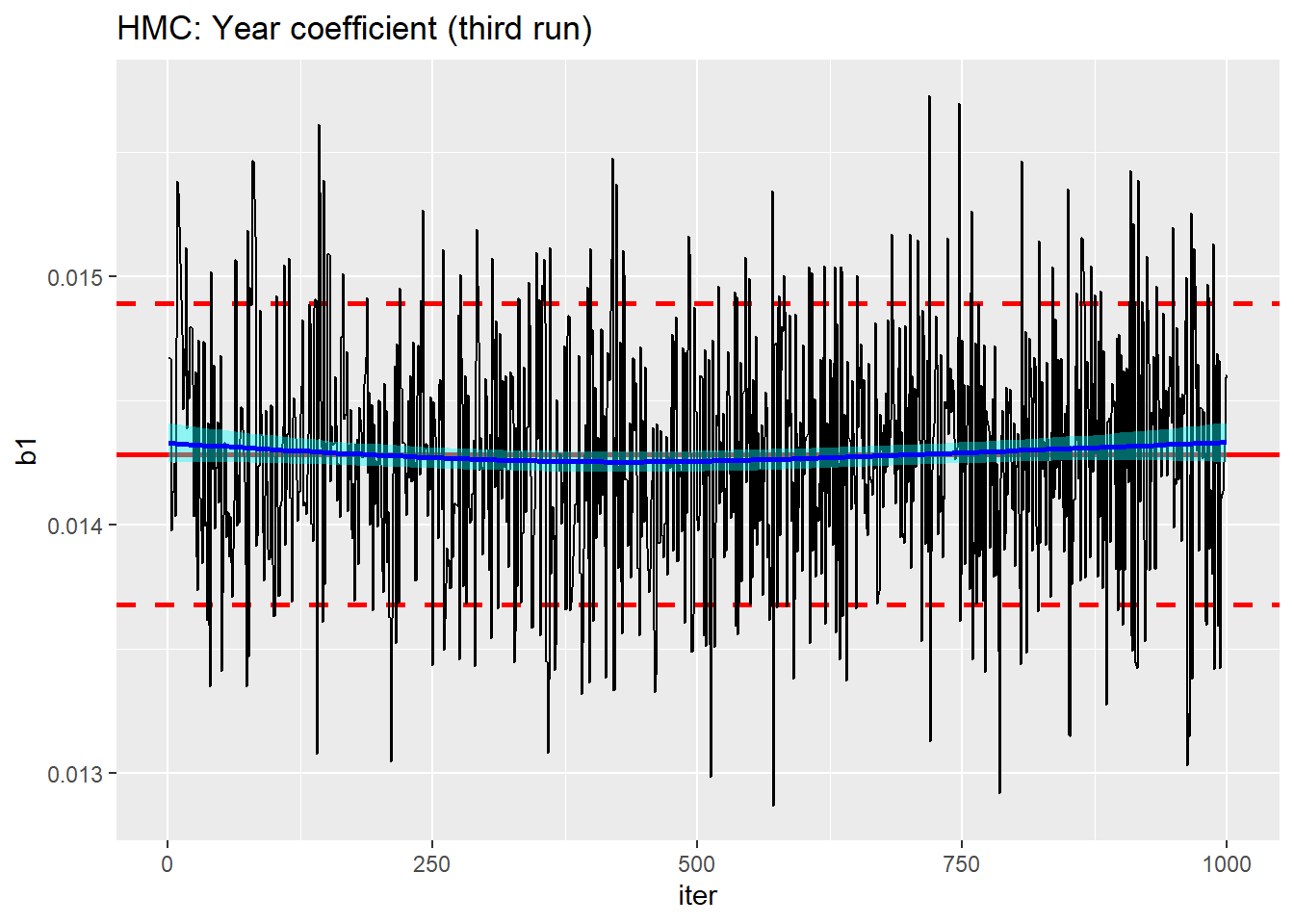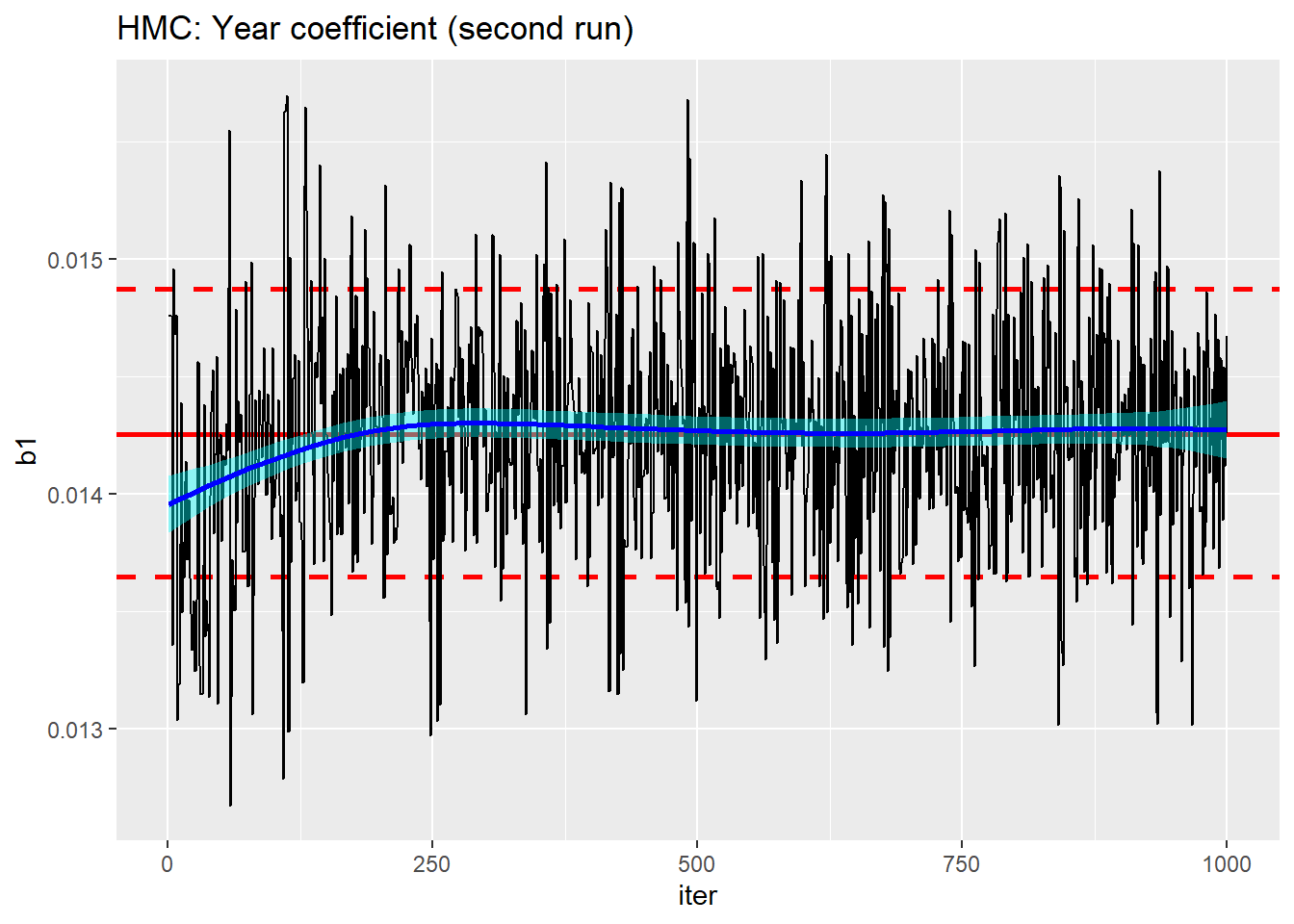 Here is a trace plot of the chain for the year coefficient, obtained from the the first run after I had started a fresh R session.