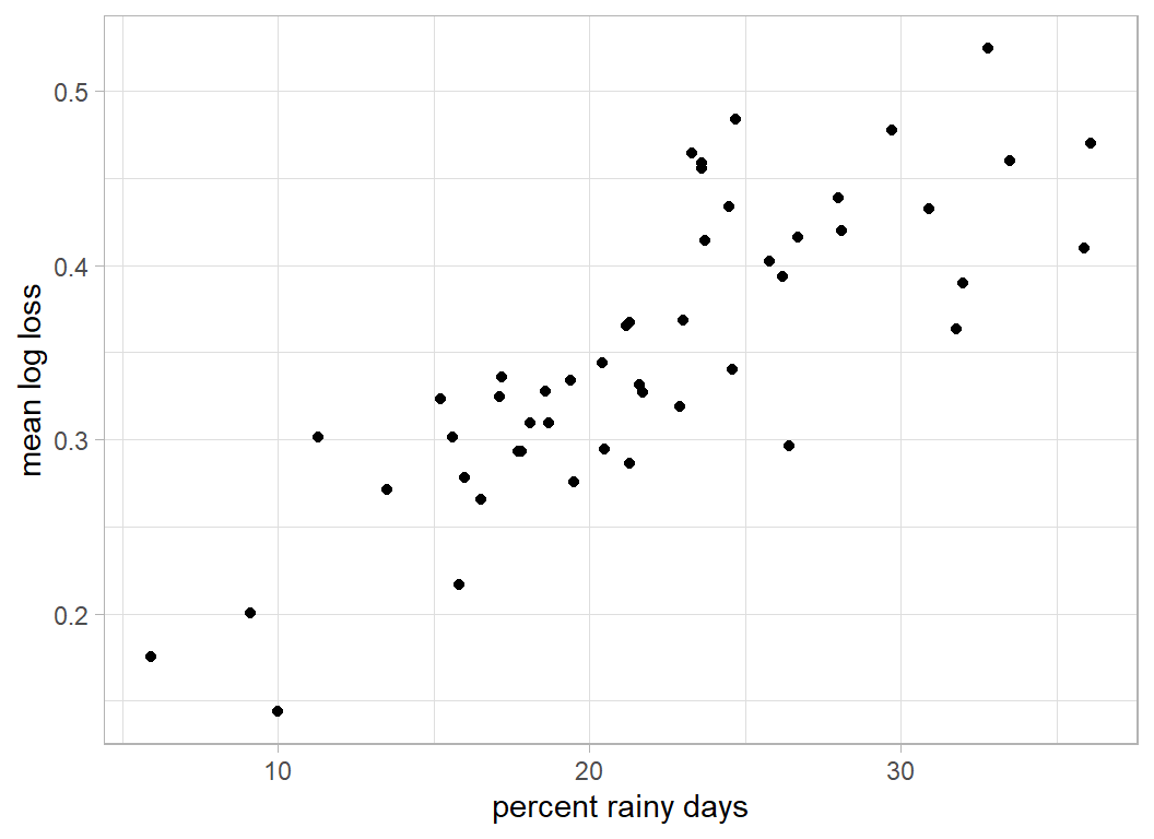 My approach: I started with the idea that location would be key to a good model and I tried two approaches, one based on average rainfall patterns for the time of year and the other based on a day’s weather predicting the weather on the following day. I used a Bayesian method to estimate the probability of rain in each month in each location. Before using the daily weather records I imputed the missing data using the mice package. I analysed each location separately by setting up a tibble with one row per location and a list column for the model fits.