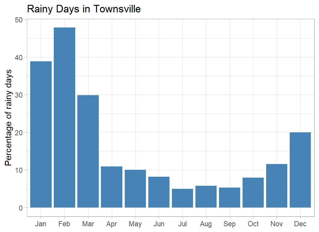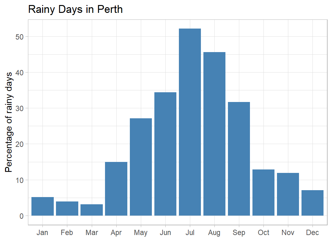 No great surprise that it rains more in the Australian winter, but it is surprising, at least to me, that Perth in July has a higher percentage of rainy days than London in January.