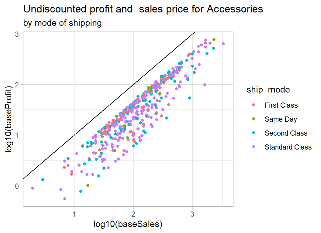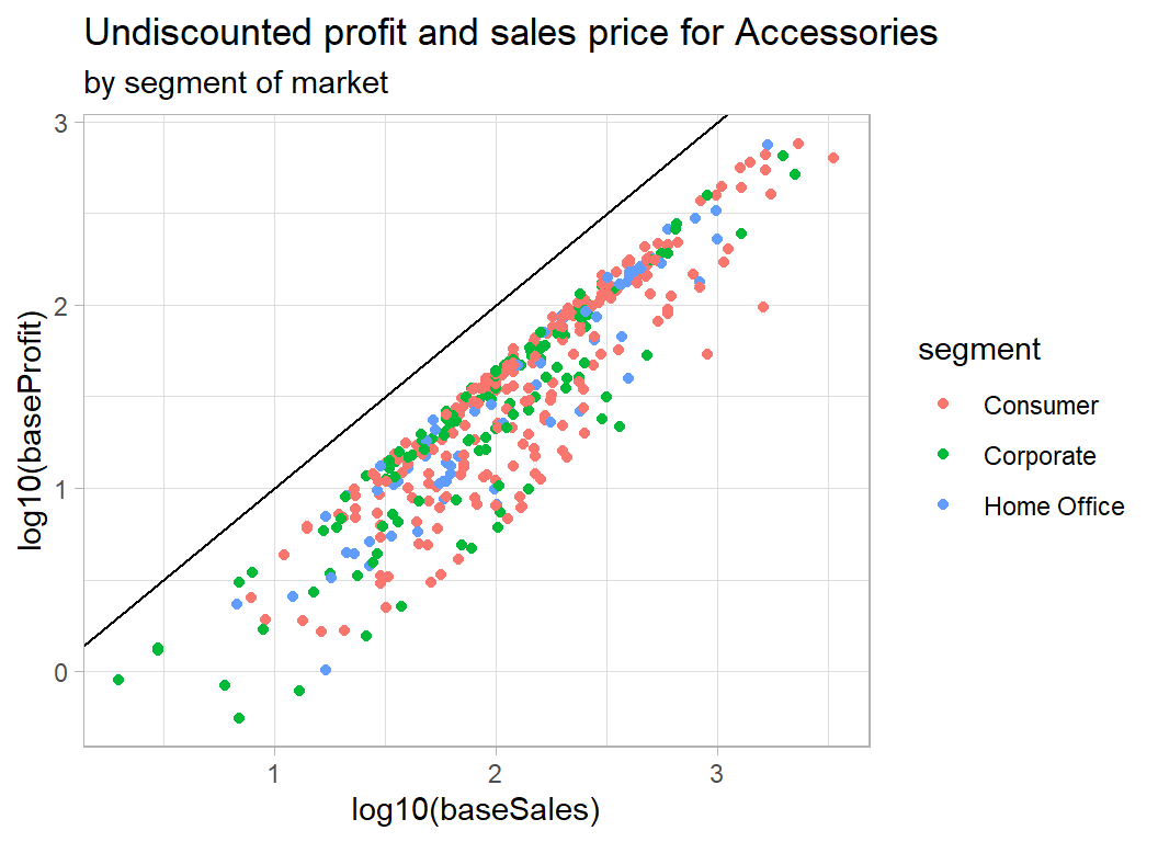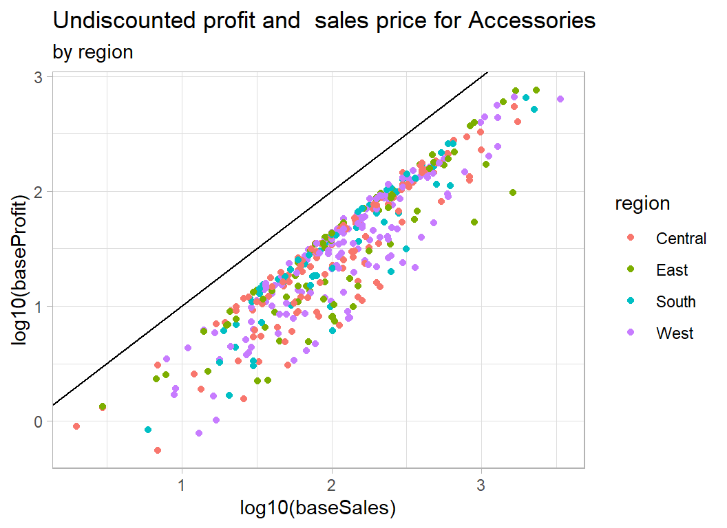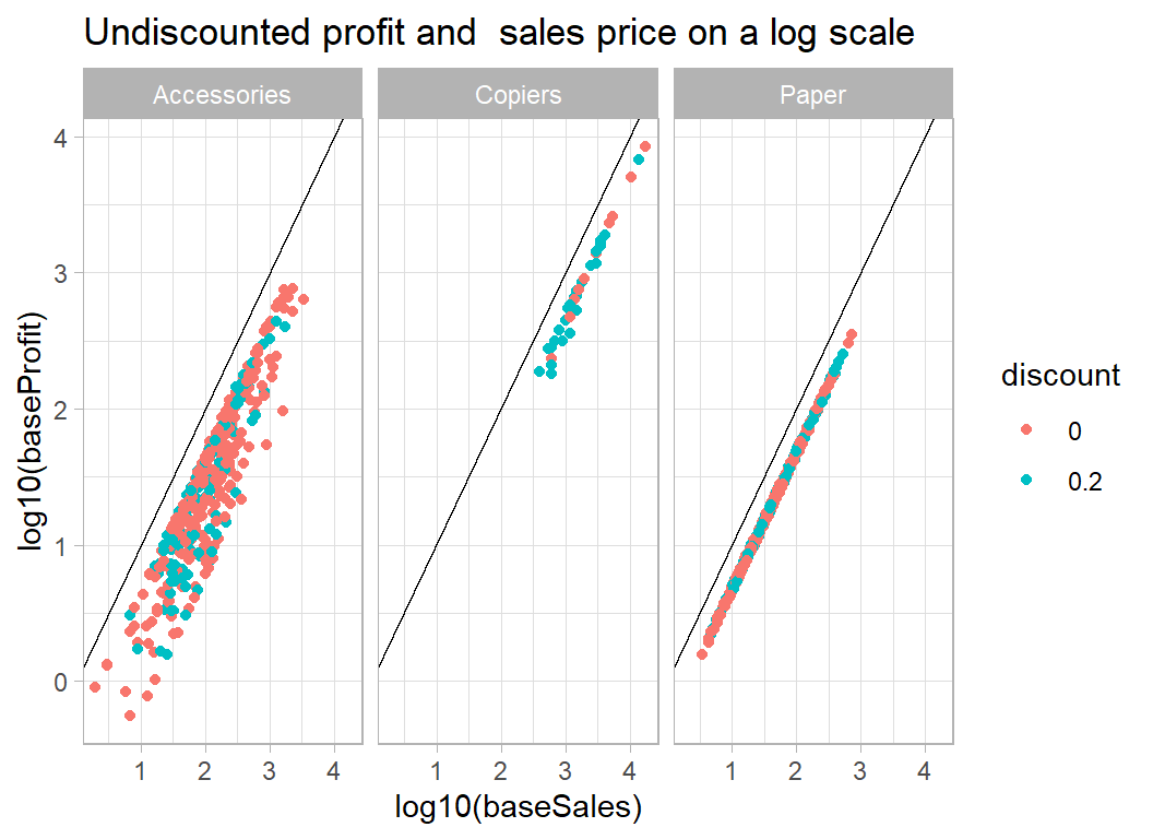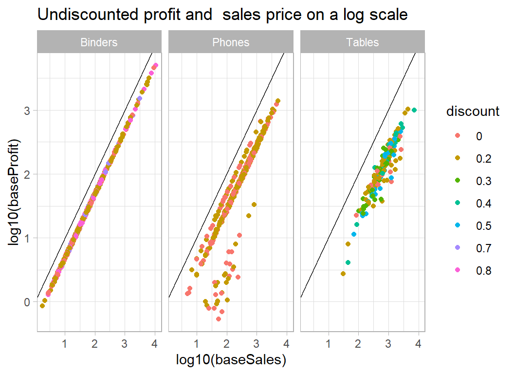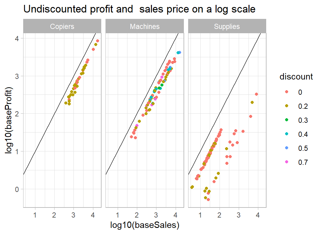 My approach: This is a good example of a problem for which we have knowledge about the structure of the data. In particular, we know the relation between sales, cost, discount and profit. Using this knowledge, I converted all sales and profits to what they would have been without a discount and I modelled the simplified data. Undiscounted profit is best described as a percentage of the undiscounted sales price, so the problem reduces to estimating that percentage. On log scales the model reduces to a series of lines with a known slope of 1 and intercepts related to the percent profit.