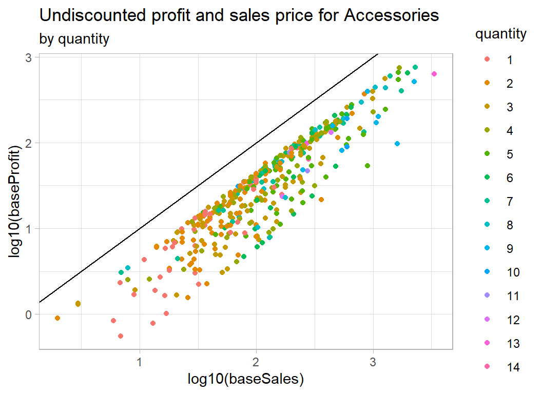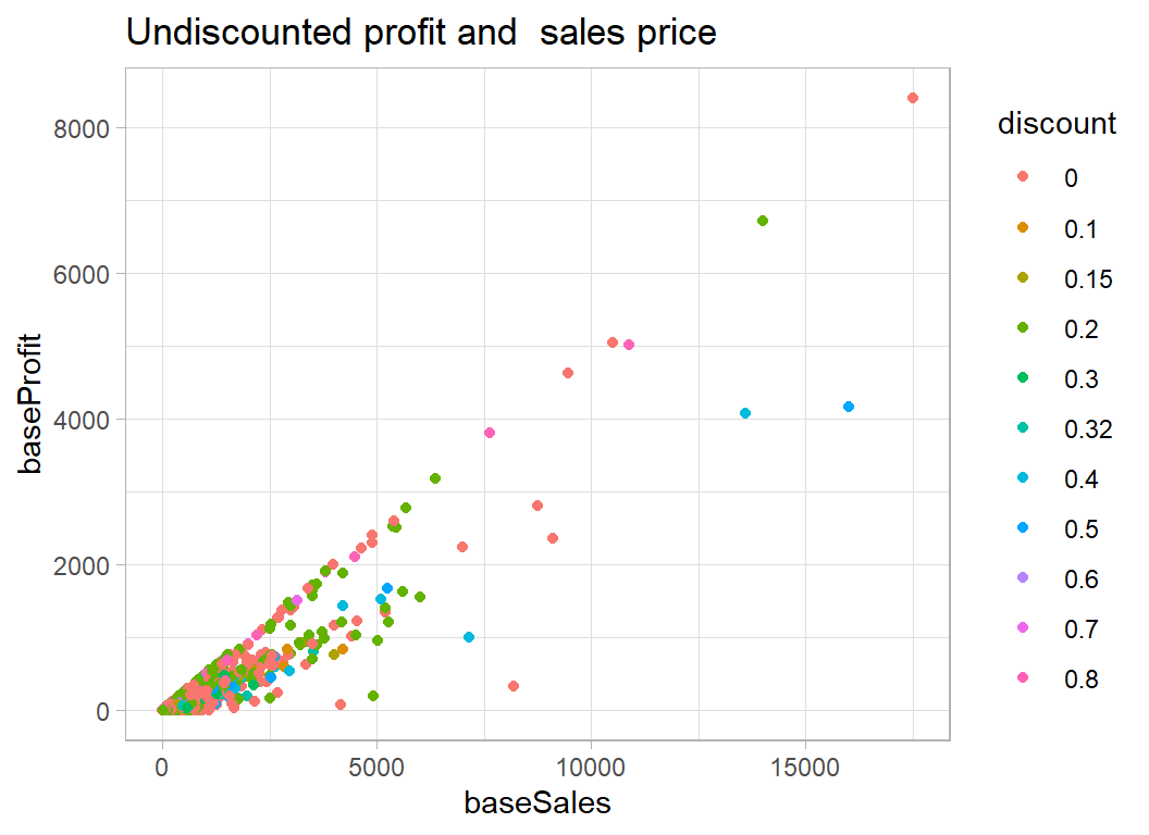 The structure of the plot of undiscounted profit and sales is of a set of straight lines that pass through the origin. This suggests that it might be better to think in terms of the percentage profit per item.
