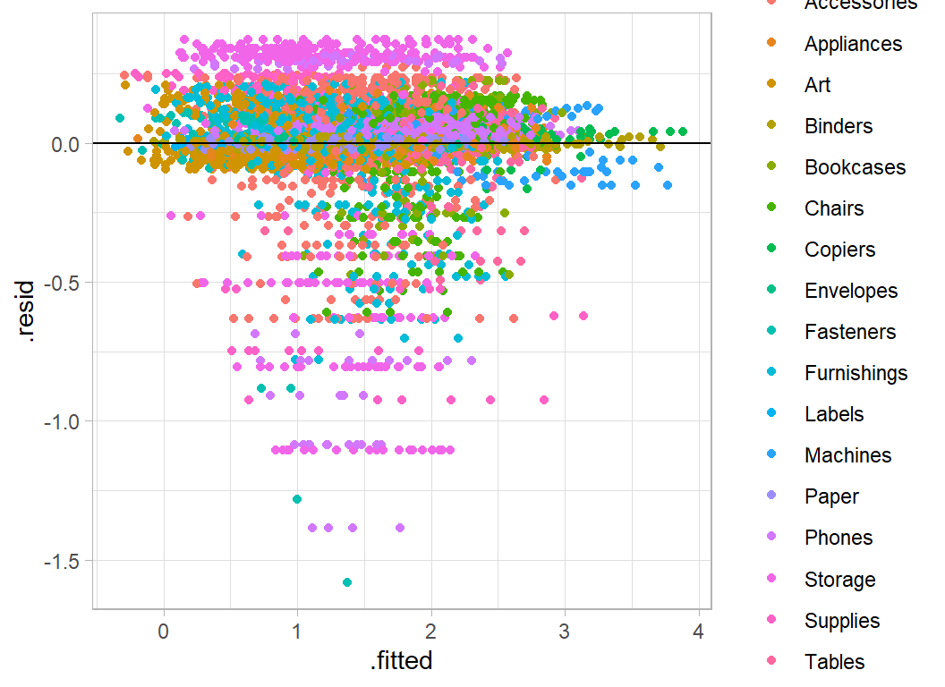 ggplot( aes(x=.fitted, y=.resid, colour=sub_category)) +
