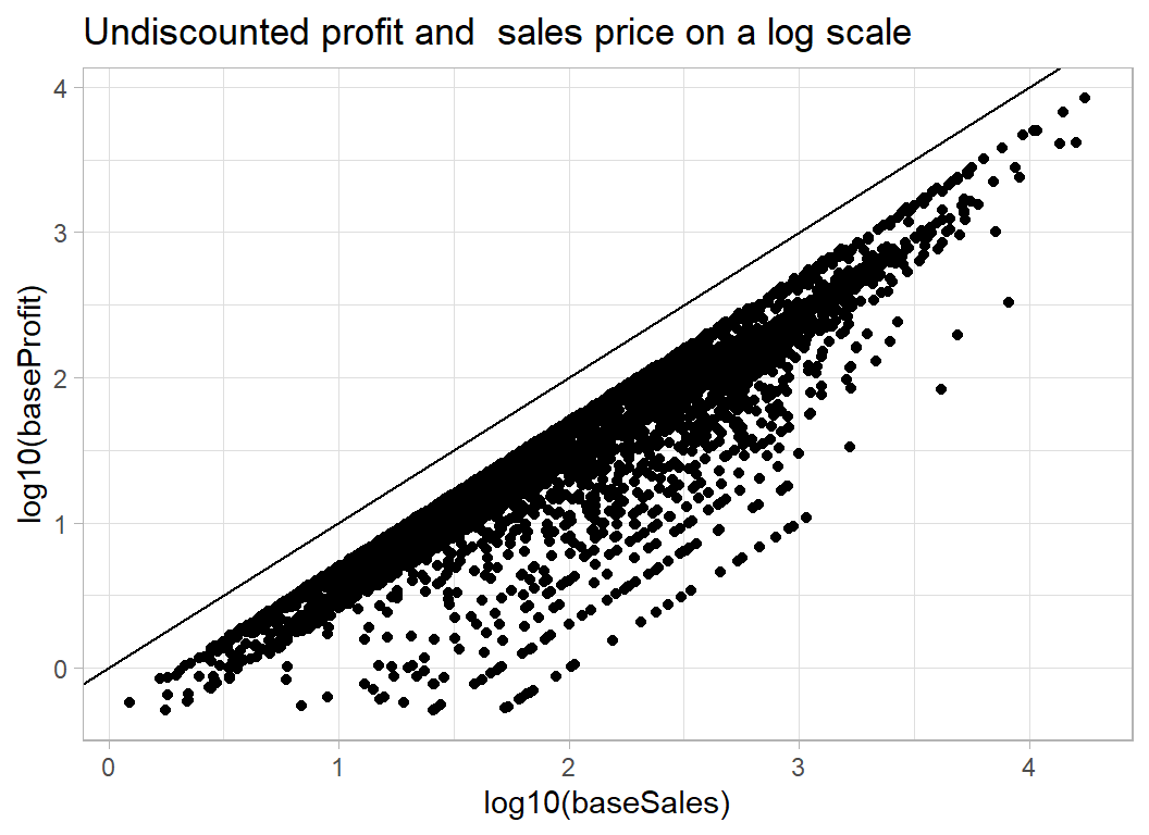 One problem with a log scale will be items sold at or very close to cost price; the rounded profit will be 0 and we will not be able to log it. We could either add 50c to those profits or drop them from the logged plot. There will not be many such items, so I have decided to drop them.
