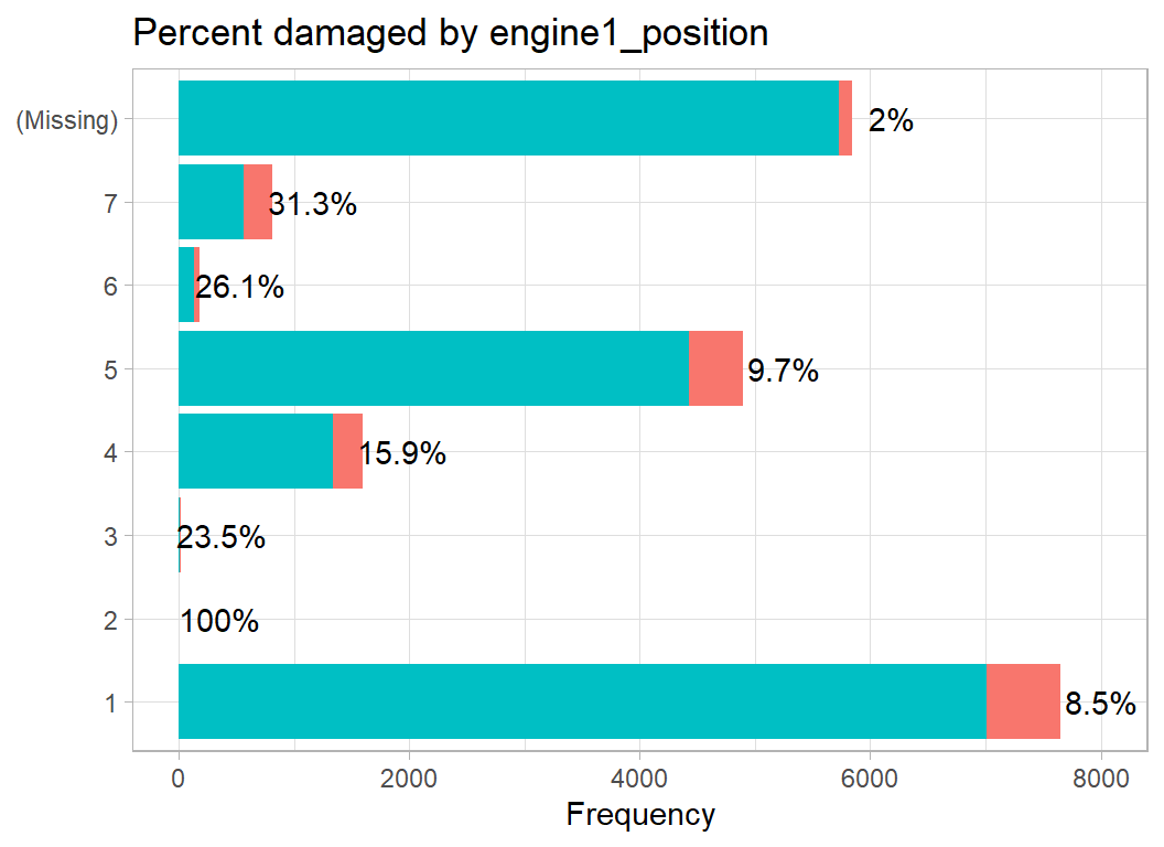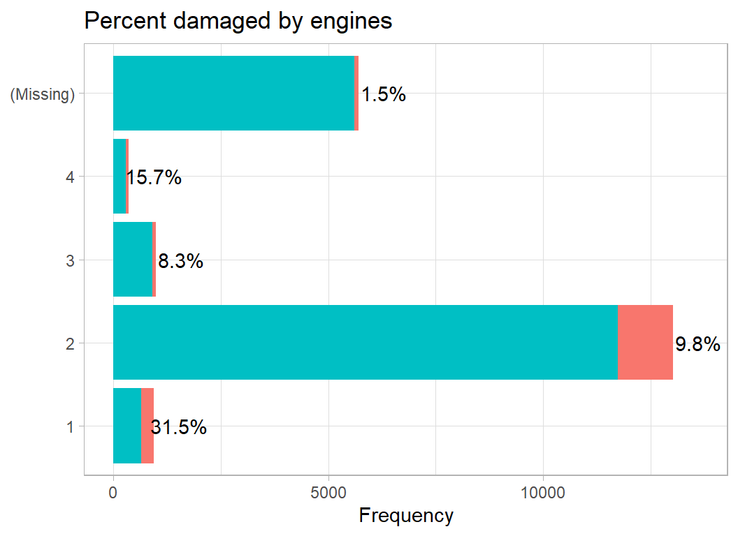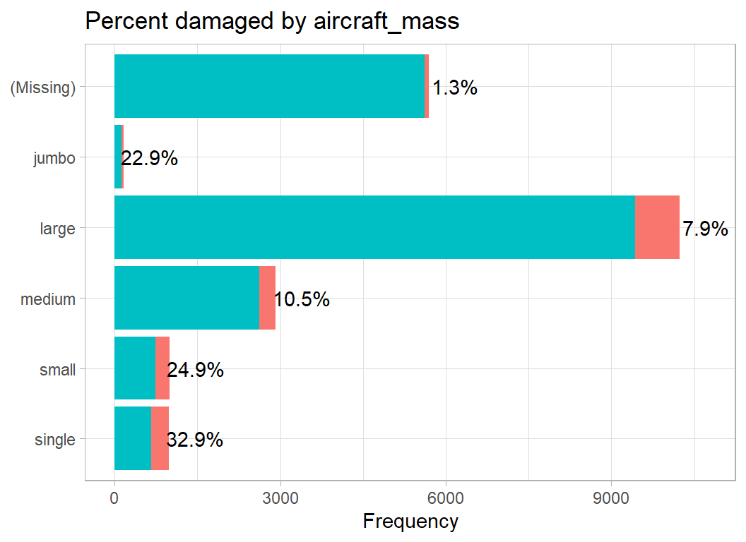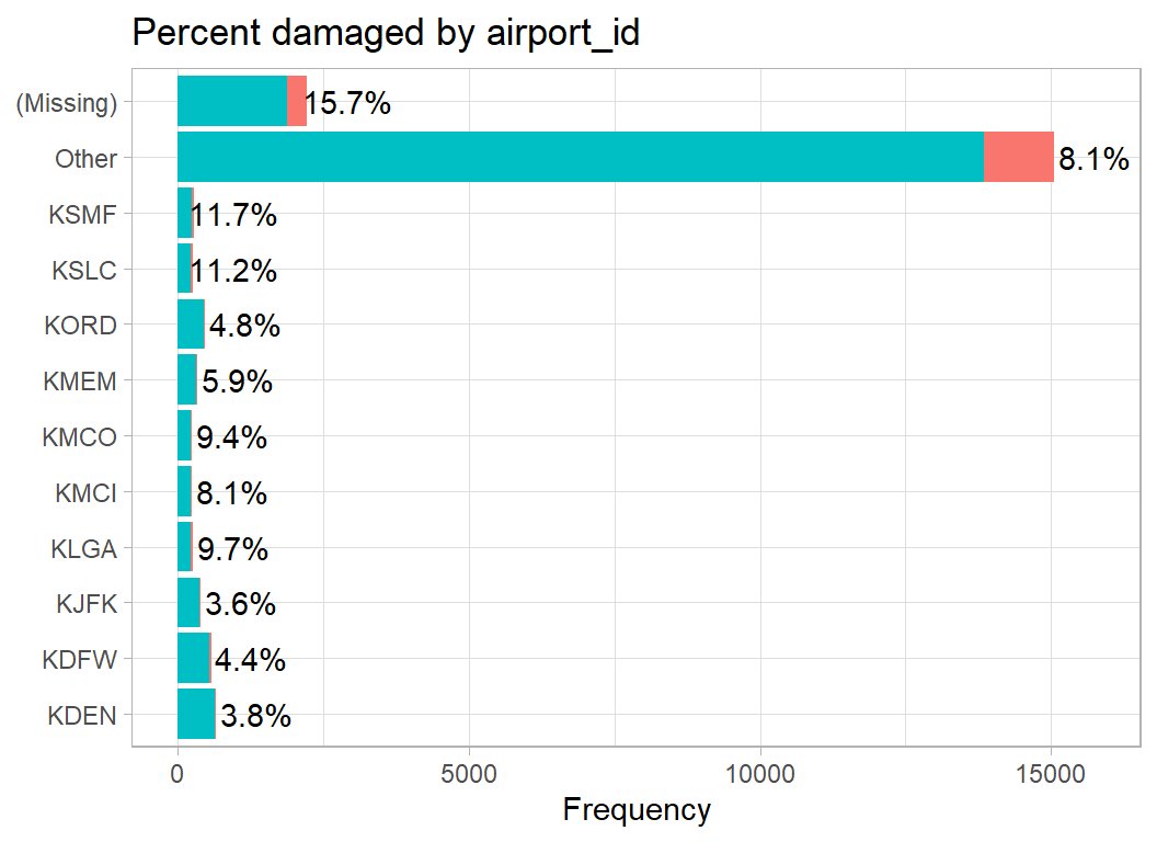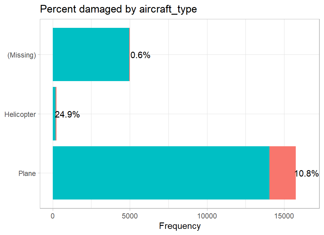 The output of skim() for the response, damaged, shows that 8.57% of reported incidents involved damage to the aircraft. I guess a far higher percentage of incidents involved damage to the animals.
