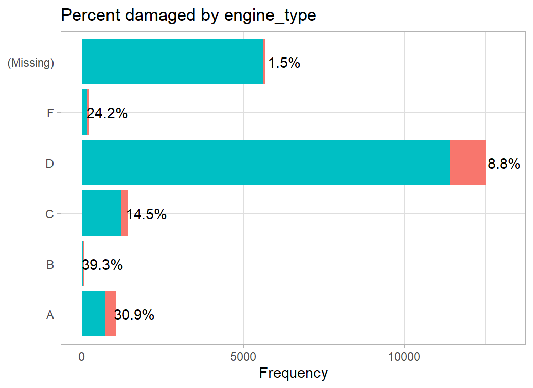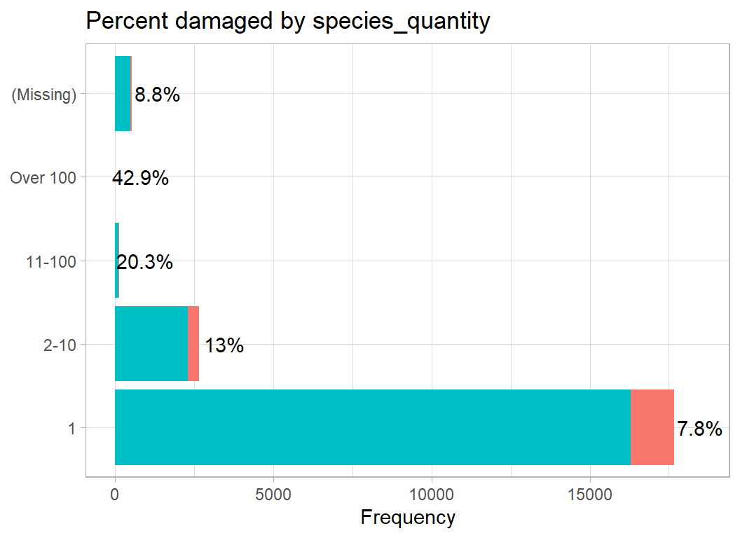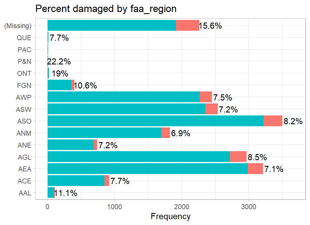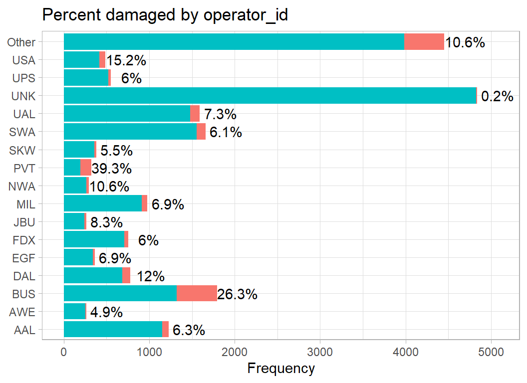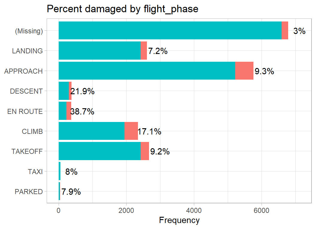 The output of skim() for the response, damaged, shows that 8.57% of reported incidents involved damage to the aircraft. I guess a far higher percentage of incidents involved damage to the animals.
