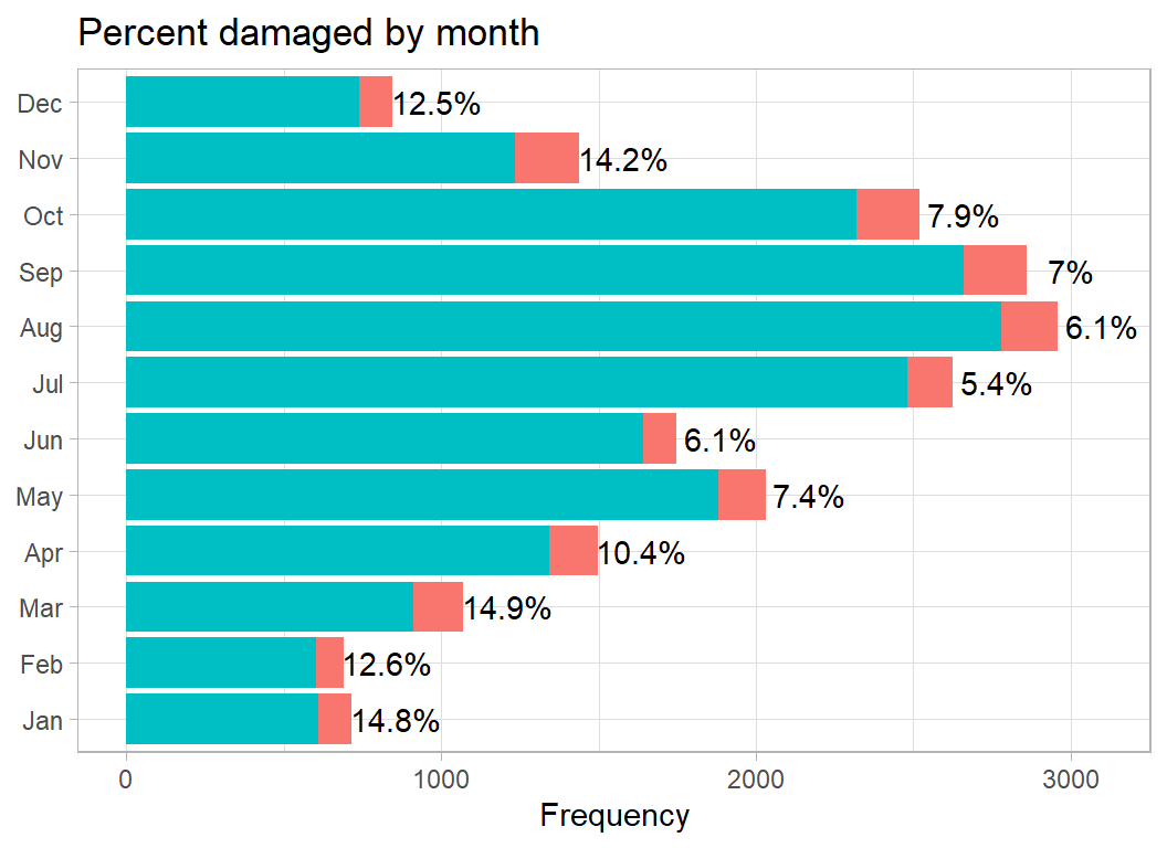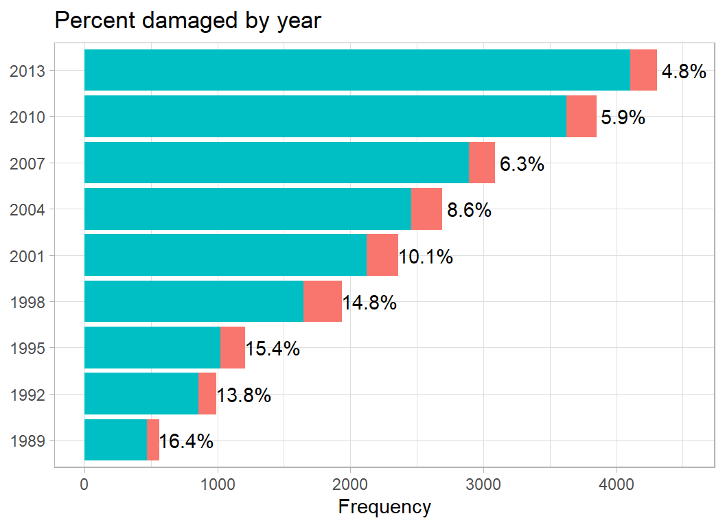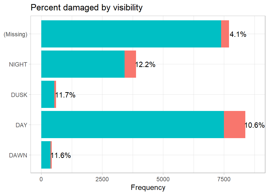 I want a visualisation that shows both the frequency of different codes and the relationship with damage, so I wrote a function called damage_plot() that I can call for each factor.